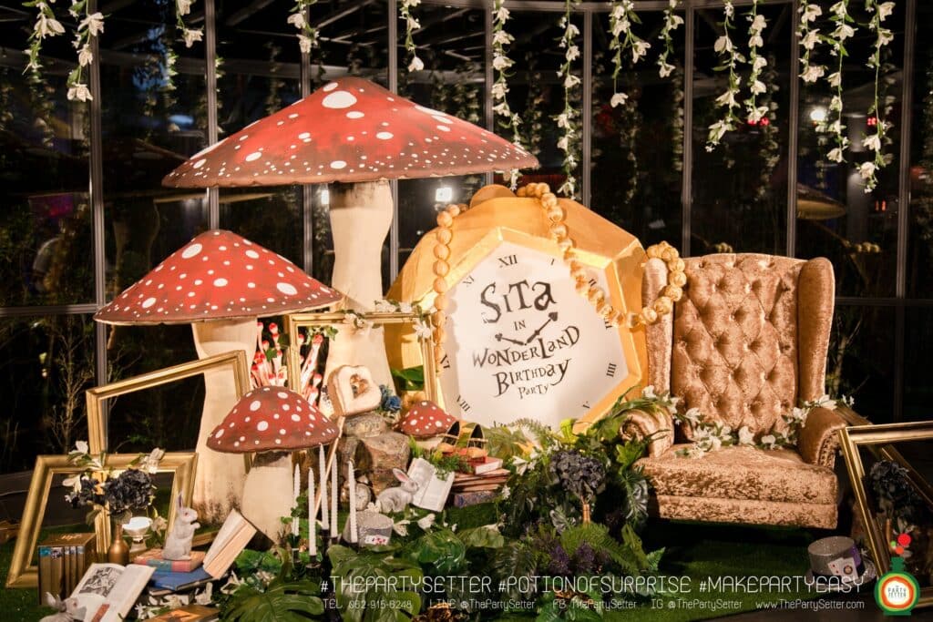 The PartySetter provided themed outfits for guests at the entrance arch, while the backdrop within the event space incorporated various sizes of mushrooms and other props related to the Alice theme to enhance the aesthetic. This event was filled with a whimsical, playful atmosphere, adding color and excitement to the entire celebration.