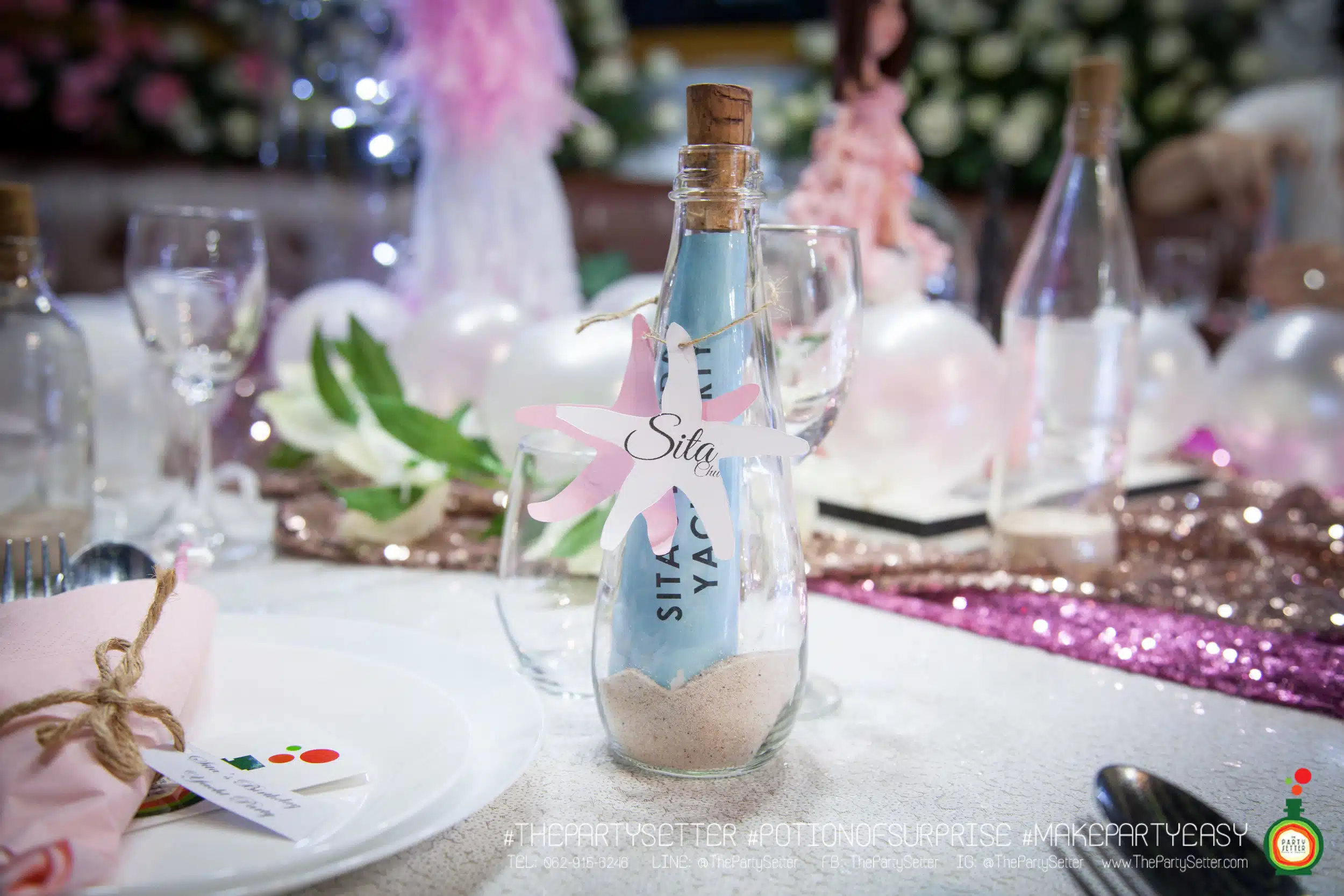 Message in a Bottle party theme is inspired by the romance of the belief that a message sent out into the vast ocean will one day reach its destined soulmate. It tells the story of a bottle containing a message inside that has traveled through different atmospheres of the vast ocean, making you feel as if you are surrounded by the expansive sea and the journey it carries.