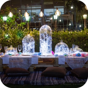 Night Garden party theme is inspired by the idea of a cozy picnic in the garden, but with a twist—adding vibrant lighting to transform the atmosphere. It tells the story of a relaxed gathering with friends, where you feel like you’re enjoying meaningful conversations with your guests under the night sky. The whole setting is filled with warmth, perfect for a delightful evening meal.