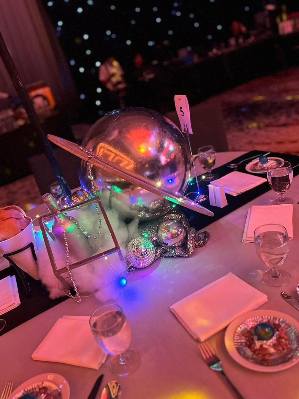ของตกแต่งตามTheme กลางโต๊ะ ขนาดประมาณ 0.30×0.30×1.20 m เป็นจุดเด่นตามธีมที่อยู่กลางโต๊ะ จุดนี้ หากต้องการตกแต่งบรรยกาศทั่วไปของสถานที่ และหากมีการนั่งเป็น โต๊ะอยู่เต็มพื้นที่สามารถเลือก การตกแต่งโต๊ะแบบนี้ เพื่อช่วยให้งานดูเต็มโดยรวมได้เลยทีเดียว เพราะ ระดับที่ตั้งของ ตกแต่งบนโต๊ะเป็นการตกแต่งแบบที่เมื่อแขกเข้างานของจะสูงพอที่จะไม่ทำให้บดบังความสวยงาม และ ไม่ไกลตาเกินไปทำให้ของตกแต่งดูเล็ก จนทำให้ต้องใช้ของตกแต่งเยอะเกินจริง