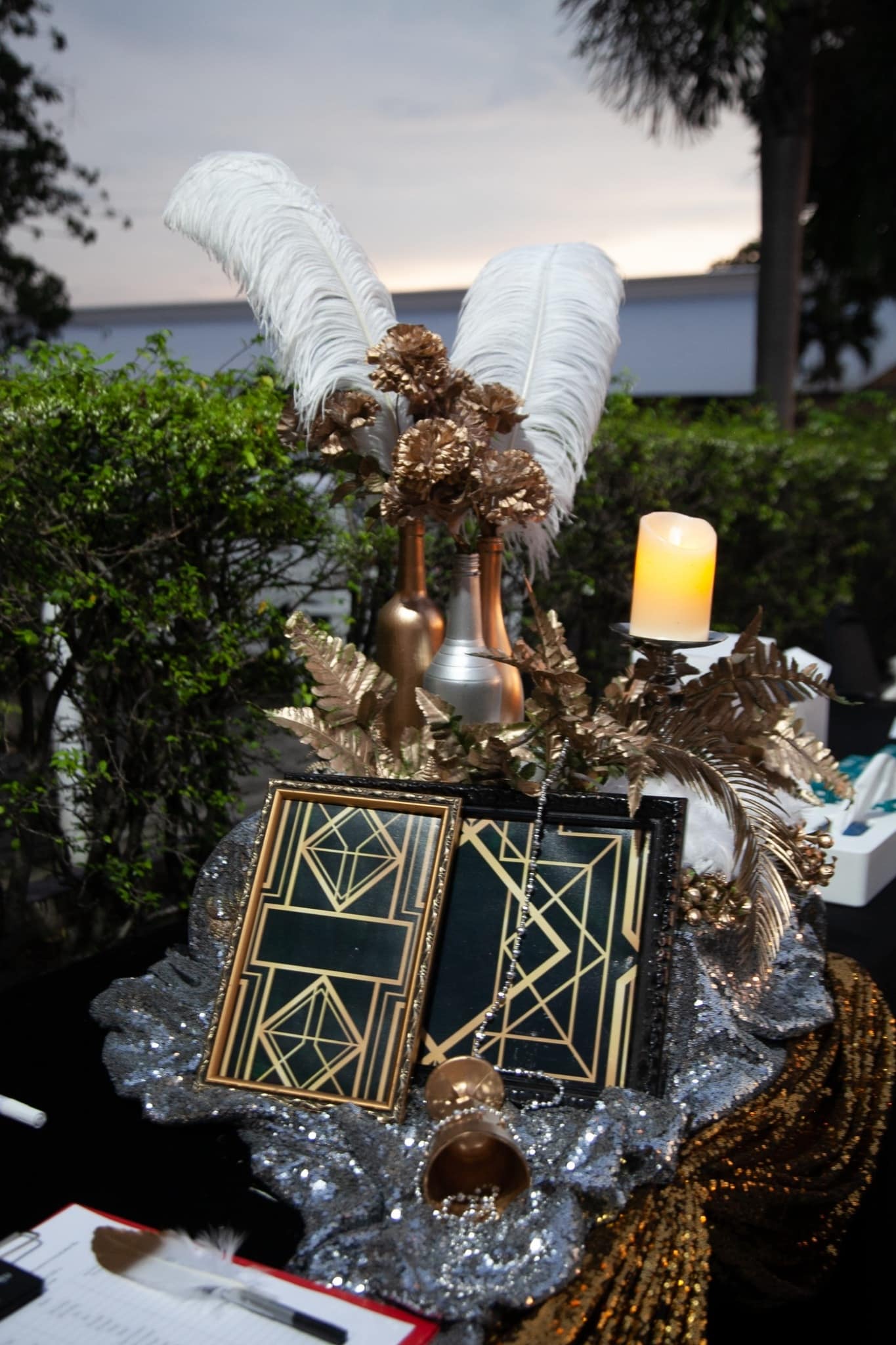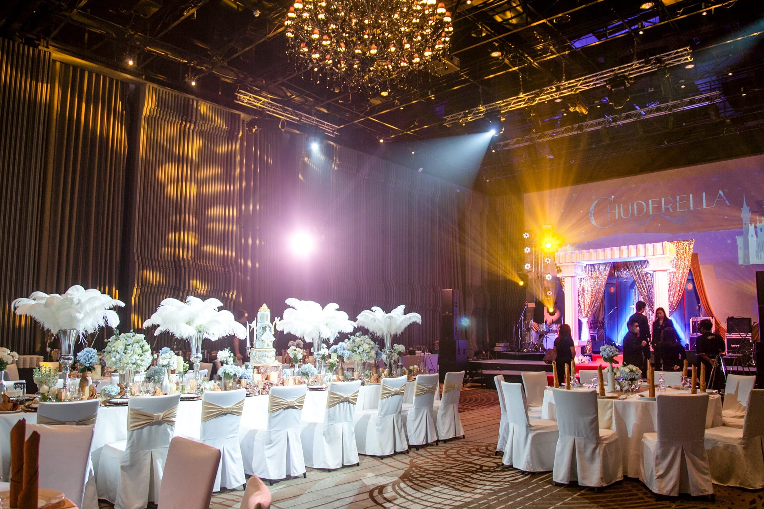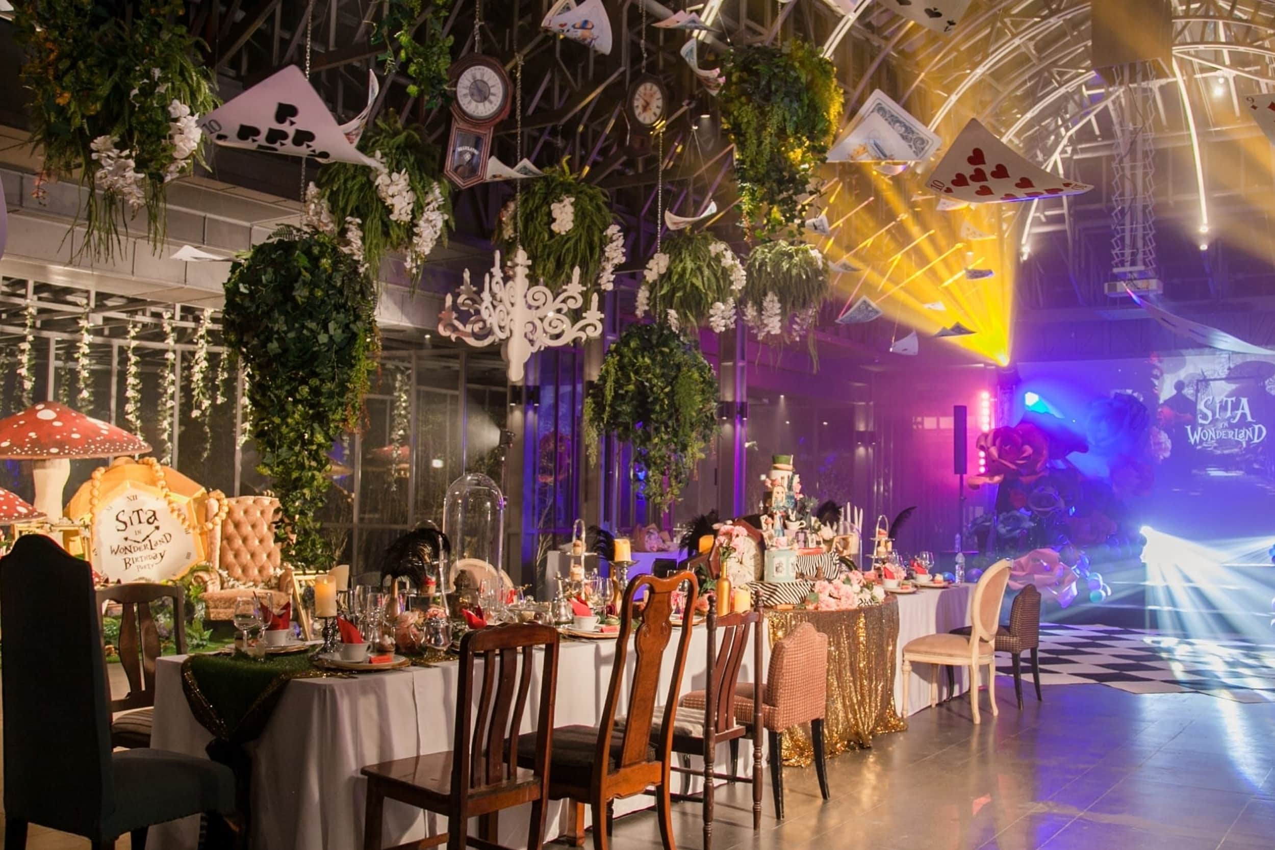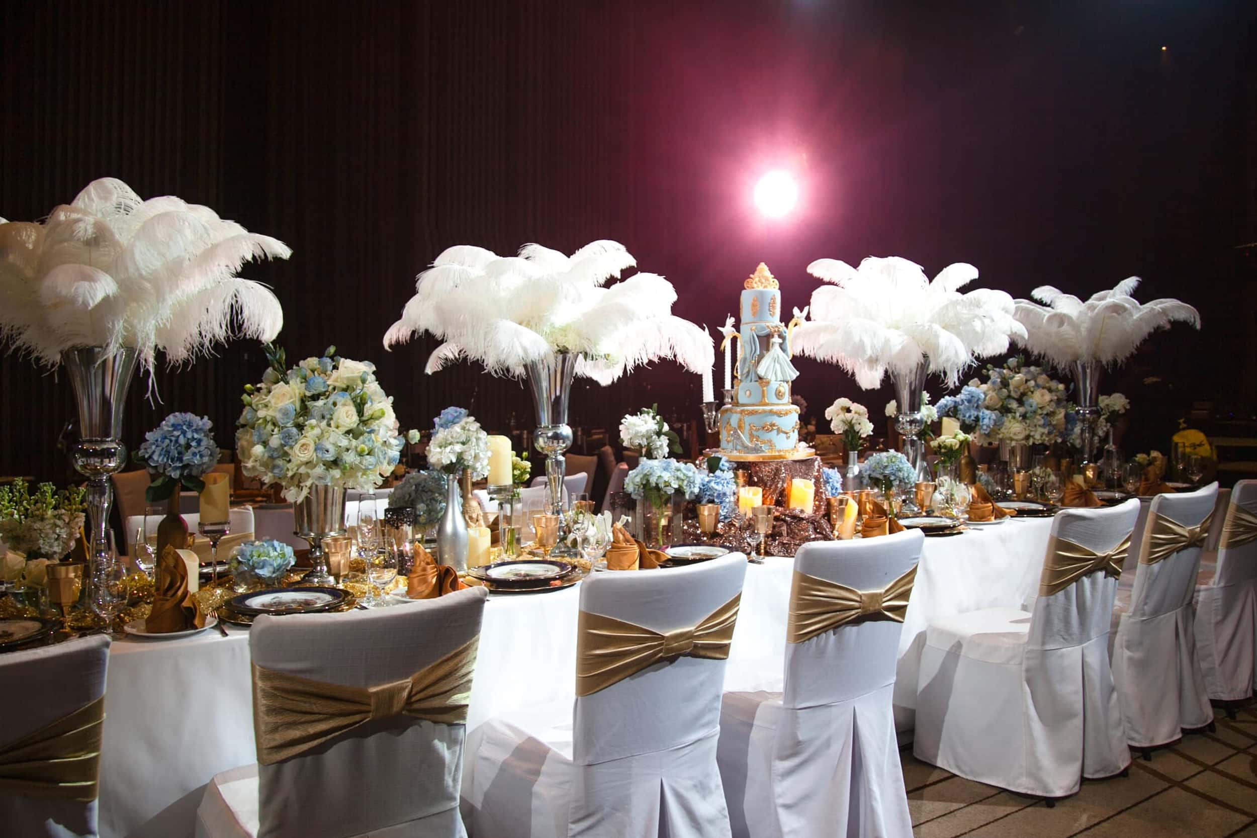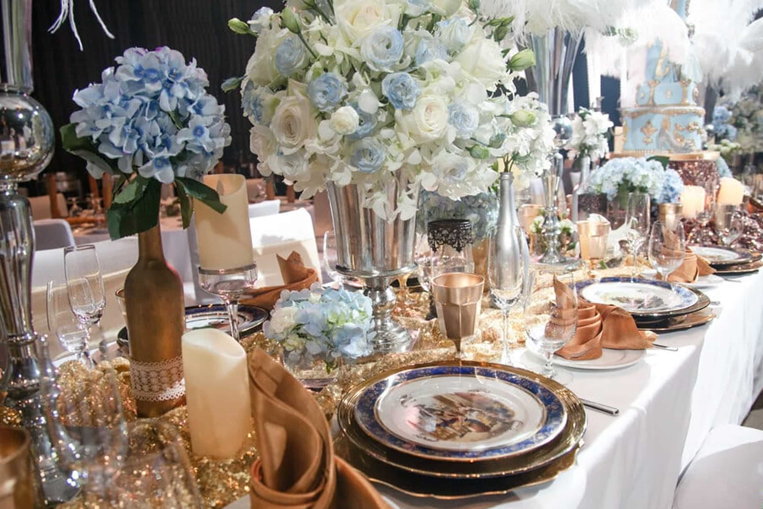 ของตกแต่งตามTheme กลางโต๊ะ ขนาดประมาณ 0.30×0.30×1.20 m และการลงหน้าจาน ตามธีม รวมถึงการตกแต่งเก้าอี้ตามธีม เป็นการจัดตกแต่งที่ค่อนข้างเต็ม มีรายละเอียดมาจนถึงกิมมิคเล็ก ๆ ที่ทำให้รู้สึกถึงความใส่ใจในรายละเอียดของ ธีม ในการออกแบบไม่รวมกับ จานชามช้อนส้อมและแก้ว(ส่วนนี้ จะเป็นของส่วนทีมจัดเรื่องอาหารเป็น คนดูแล เนื่องจากจำนวนที่ต้องมีการเปลี่ยนตอนใช้งานควรเตรียมไว้ประมาณ 3 เท่าของแขกที่มาร่วมงาน) และส่วนนี้ก็จะเป็นจุดที่ทำให้งานดูเต็มเลยทีเดียว