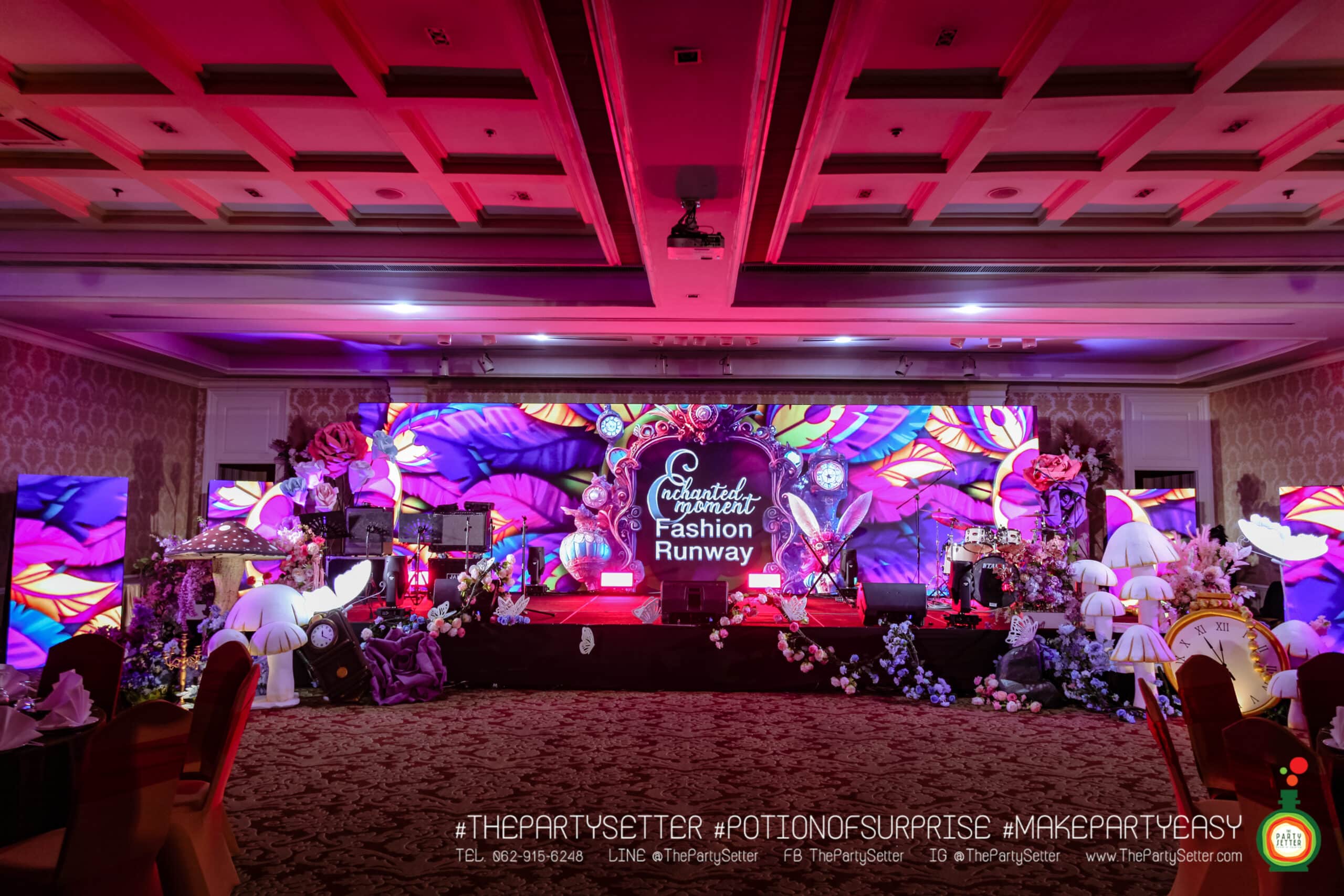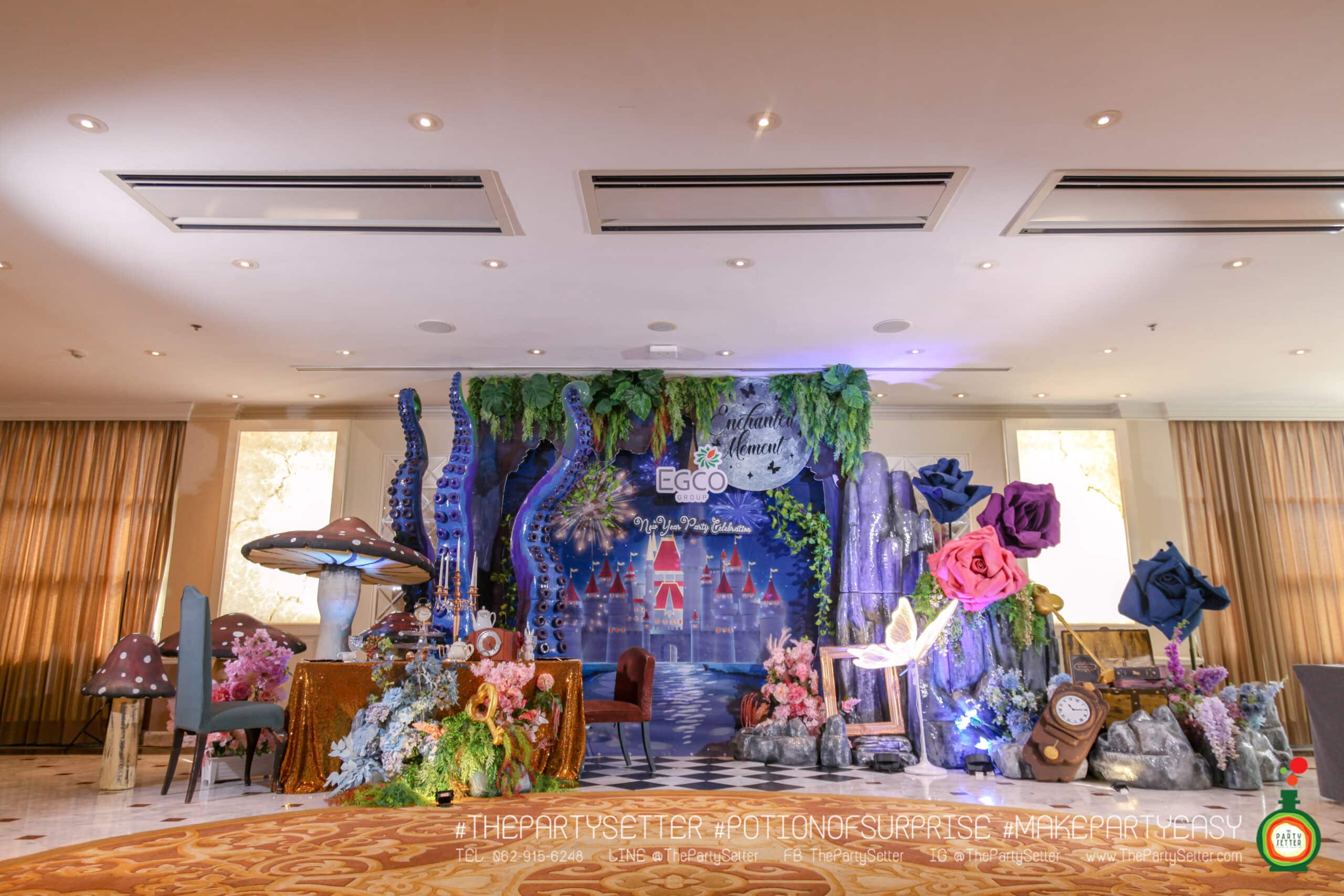 ทางทีมดีไซเนอร์จึงดึงจุดนี้มาเป็นซุ้มทางเข้าเพื่อให้ทางแขกภายในงานได้ร่วมเป็นส่วนหนึ่งในธีมนี้ ThePartySetter ได้จัดเตรียมเสื้อผ้าที่เป็นพร็อพในการแต่งตัวเข้าธีมไว้ด้วยบริเวณหน้าซุ้มทางเข้า จุด backdrop ภายในงานทางทีมดีไซเนอร์ได้นำบรรยากาศของอลิซมาผสมผสานโดยนำเห็ดหลากหลายขนาดและพร็อพเกี่ยวกับธีมนี้เข้ามาเสริมให้สวยงามมากขึ้น การจัดงานในครั้งนี้อบอวลไปด้วยความแฟนซี สนุกสนานเพิ่มสีสันให้กับงานเป็นอย่างยิ่ง