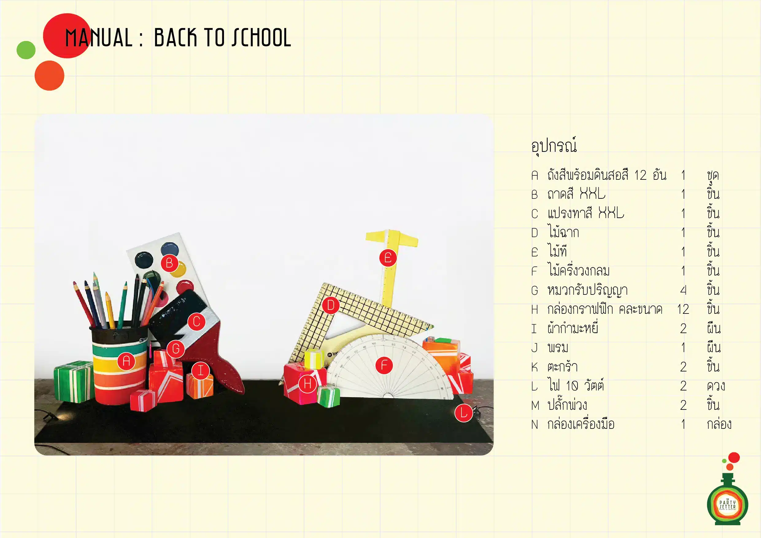 จุดเด่นคือ การได้ถ่ายภาพกับสัญญลักษณ์ของโรงเรียน ที่ได้รู้สึกเหมือนย้อนวัยกลับไป ประกอบไปด้วย อุปกรณ์ ไม้บรรมัด ดินสอ ยางลบ แปรงสี รวมไปถึงหนังสือ และอุปกรณ์ประจำวิชาต่างๆ ไม่ว่าจะเป็น วิชาวิทยาศาสตร์ เลข หรือวรรณคดี เหมาะกับงานวันเกิด เซอร์ไพรส์วันเกิด งานแฟนซี ตกแต่งสถานที่ งานเลี้ยงบริษัท งานที่ต้องการย้อนวัย