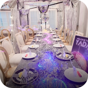 ธีมวันเกิดยอดฮิตก็หนีไม่พ้นธีมดิสโก้ เป็นการเฉลิมฉลองวันเกิดด้วยดินเนอร์สุดหรูหราท่ามกลางการตกแต่งด้วยดิสโก้บอล ดอกคาร์เนชั่นสีชมพูสดและขนนกสีขาว เพิ่มความไฮคลาสเข้าได้กับทุกสถานที่ทำให้มื้ออาหารในค่ำคืนสุดพิเศษสร้างความประทับใจและน่าจดจำ เรื่องปาร์ตี้ไว้ใจ The Party Setter ทีมงานคุณภาพพร้อมให้บริการอย่างเต็มที่ค่ะ