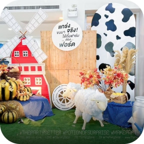 งานปาร์ตี้ธีมฟาร์มสุดน่ารักโดย The Party Setter พร้อมบริการตกแต่งครบวงจร – มีสัตว์ฟาร์มน่ารักๆ อุปกรณ์ประกอบฉากสีสันสดใส และรายละเอียดที่มีชีวิตชีวา เหมาะสำหรับวันเกิดเด็ก ๆ และงานกลางแจ้ง